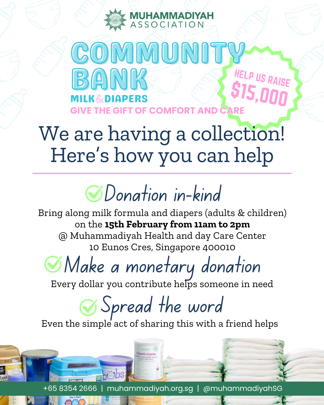 Muhammadiyah Association (MA) is thrilled to launch our inaugural Community Bank, providing vital support to over 700 low-income families with access to milk and diapers for their loved ones - from infants to seniors, and individuals with special needs.